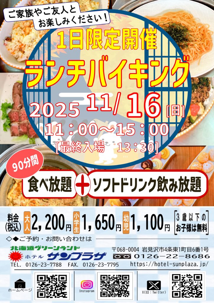 11月16日 1日限定ランチバイキング! 2025年11月5日 最終更新日時 : 2025年11月5日 サンプラザ管理 皆さん、こんにちは!!🍂9月・10月🍁 に続き🌕️11月も開催します!!『1日限定開催!ランチバイキング』今月は 11月16日(日) です!料金は以下の画像の通りになります。不明な点がございましたら、北海道グリーンランド ホテル サンプラザ 『相談コーナー』にご連絡ください!